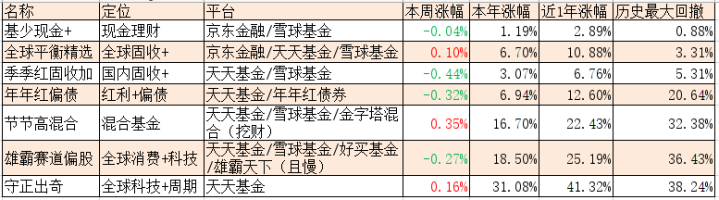 本周金融、港股、纯债跌幅较大,美股也有一定回调,拖累稳健组合表现,但芯片为主的科技类指数较为强势,推动积极组合继续上涨。