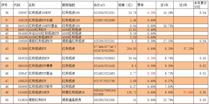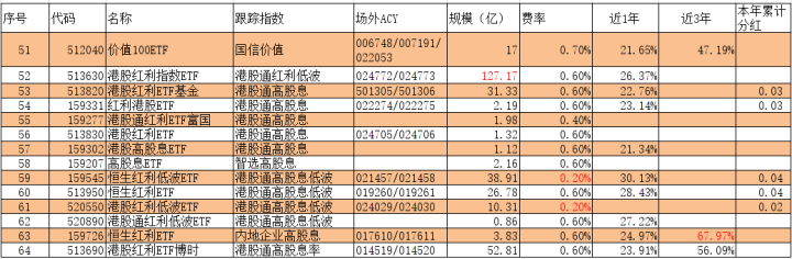 今年以来每份分红较高的是红利ETF(510880,0.142元)、港股通红利ETF(513530,0.06元)、央企红利ETF(561580,0.055元)。